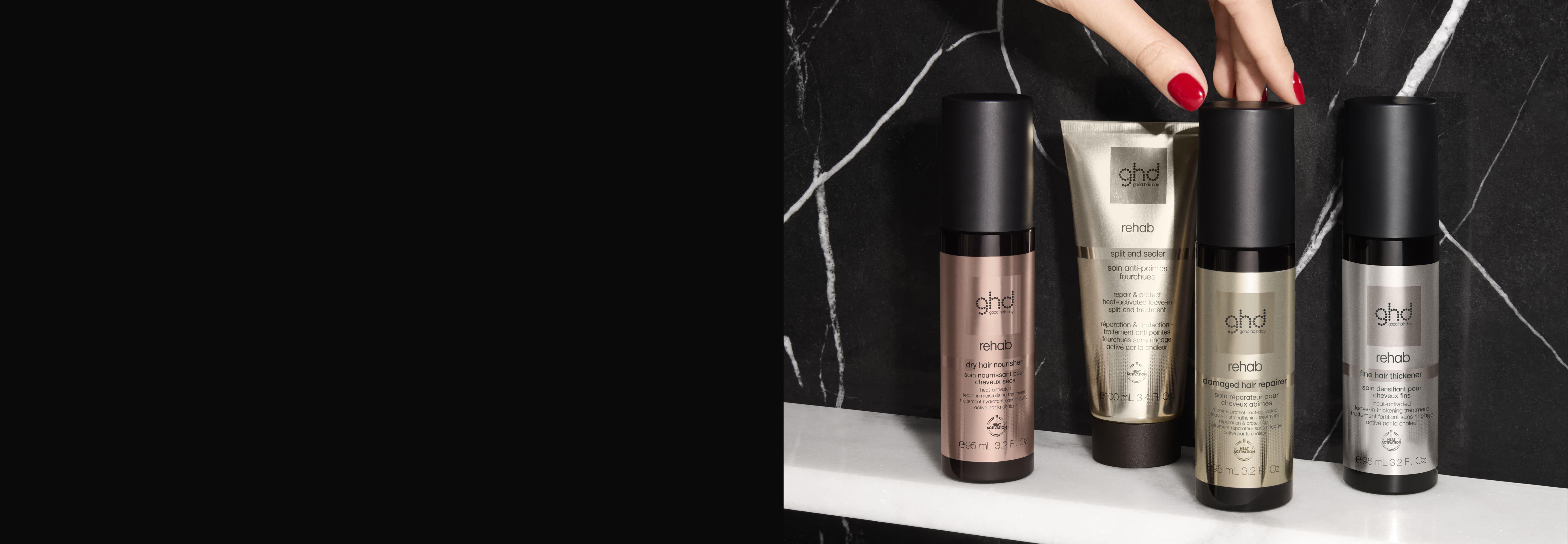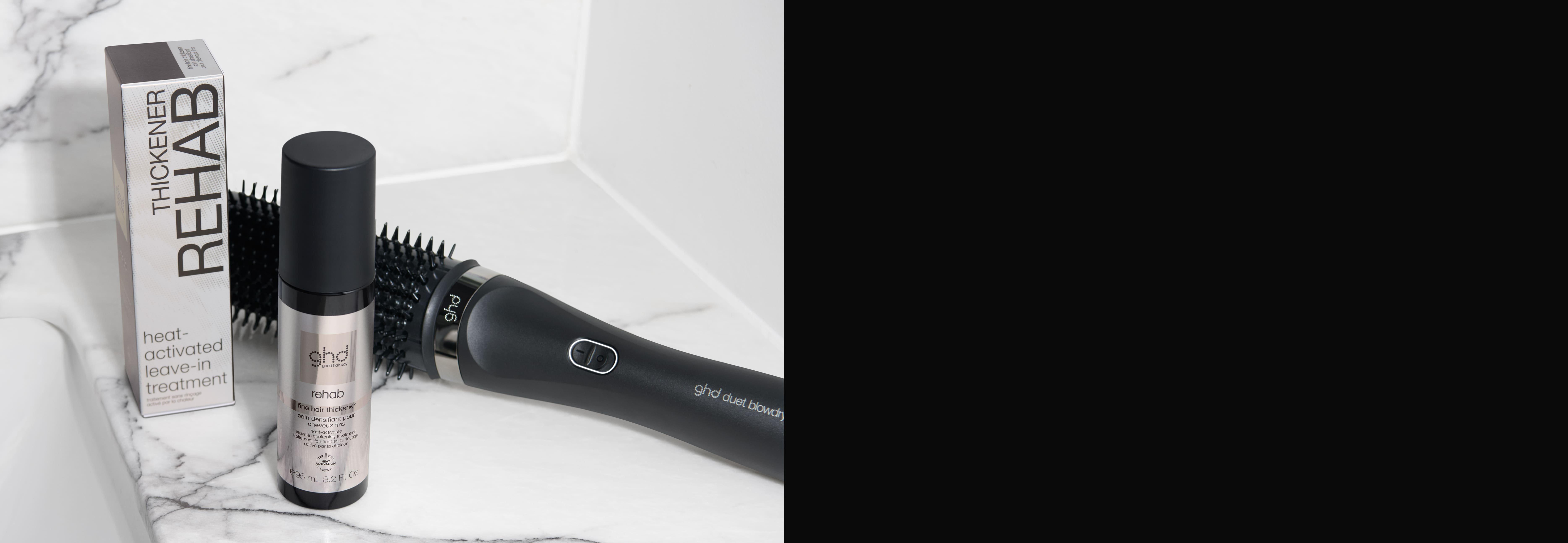 ¹Vs naturally dried fine hair. ²Consumer testing, Sep’23. 77% of 97 women agreed ghd rehab makes hair instantly thicker-feeling and 80% agreed it makes hair instantly fuller-feeling, vs before using rehab and heat styling.