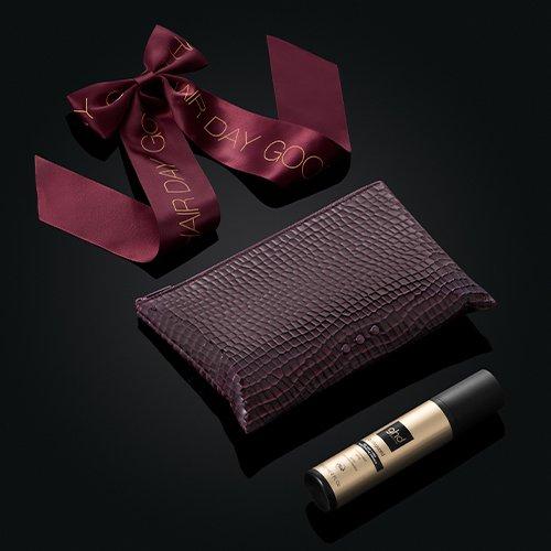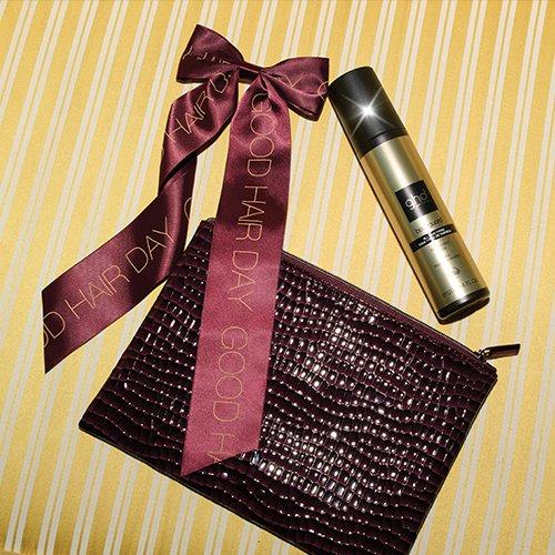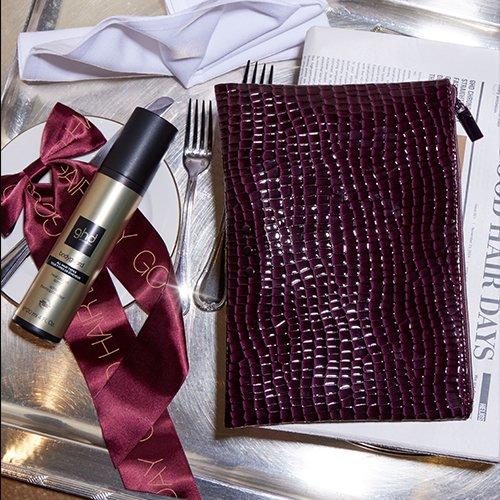 Unser ghd bodyguard Hitzeschutzspray für alle Haartypen und eine Limited Edition Haarschleife in einem kirschrotem Täschchen mit Kroko-Optik.