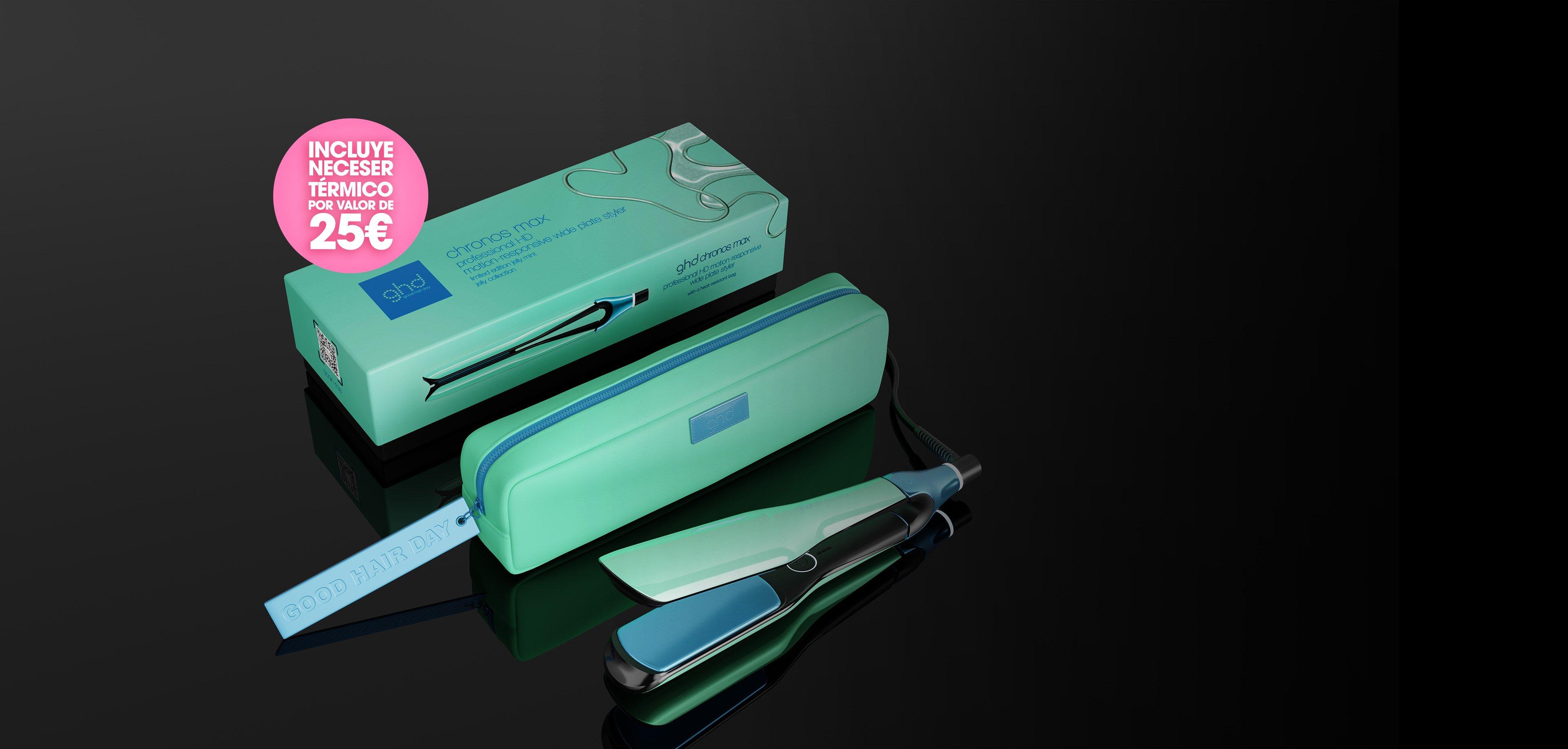 La nueva ghd Chronos Max jelly mint se presenta en un refrescante y alegre color turquesa, acompañado de un lujoso neceser térmico a juego resistente al calor valorado en 25€.
