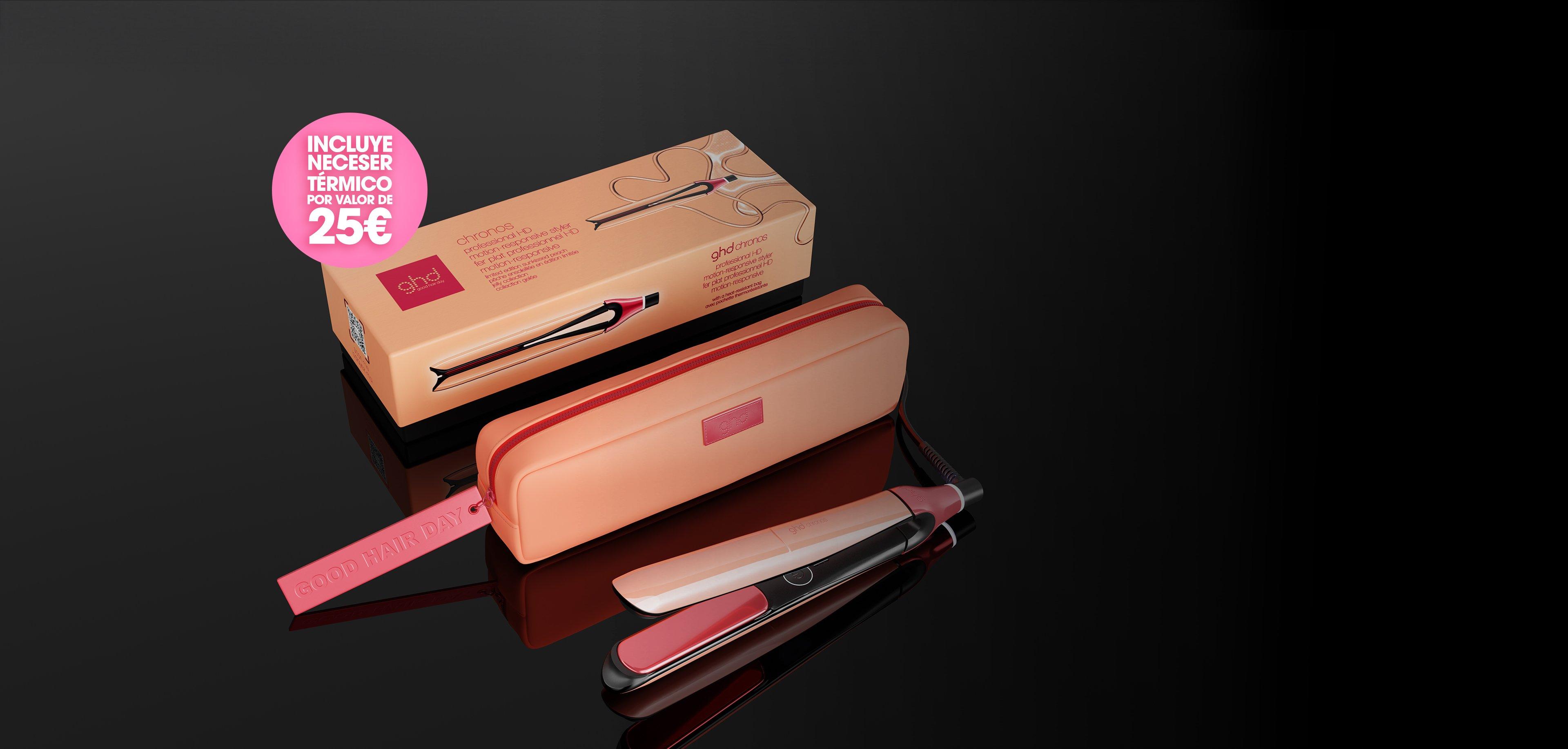 La nueva ghd Chronos sun-kissed peach se presenta en un dulce y refrescante color melocotón, acompañado de un lujoso neceser térmico a juego resistente al calor valorado en 25€.