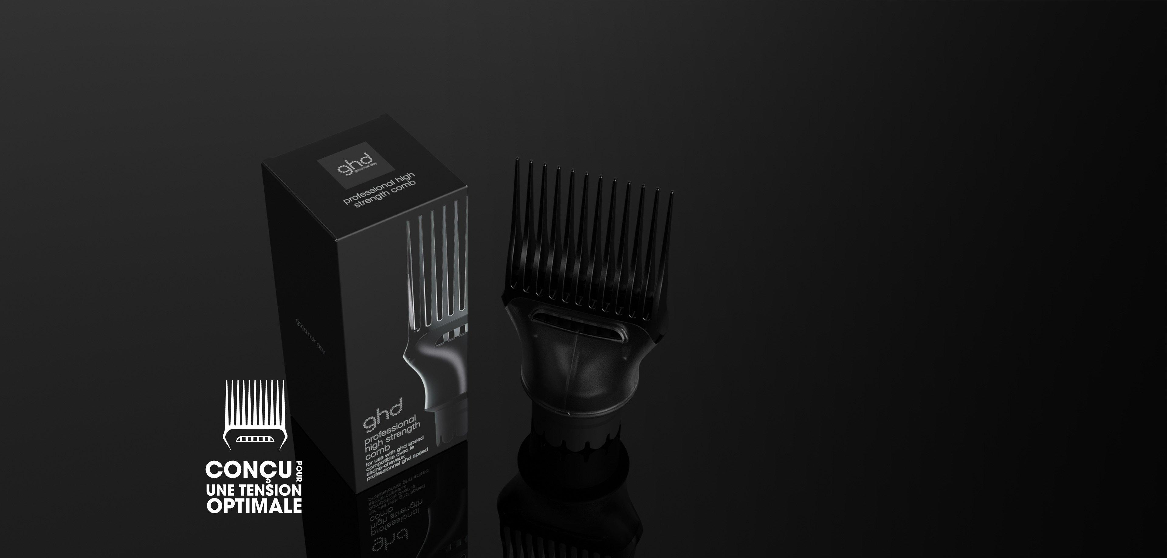 Pour un contrôle fiable et un coiffage sans effort sur cheveux bouclés et texturés, l'embout peigne professionnel ghd est un accessoire coiffage indispensable.