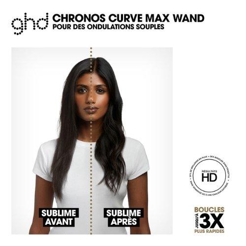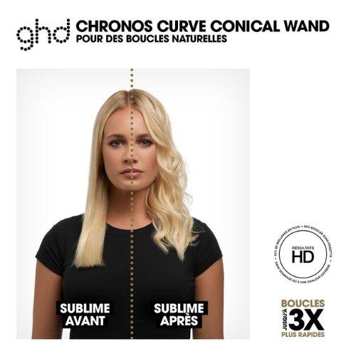 ¹Comparé à un boucleur concurrent chauffant entre 180 et 190°C. Test en laboratoire mesurant le temps nécessaire pour former la même longueur de boucles. ²Test consommateurs janvier-Février 24 : en moyenne, 73 % des 921 consommateurs interrogés ont reconnu que ghd chronos curve permet d’obtenir des boucles et ondulations sans frisottis. ³En utilisant le spray de maintien ghd. Test technique mesurant l’élasticité des boucles dans une chambre humide avec une humidité relative de 50 %. ⁴Un dommage dû à une chaleur extrême est une réduction fractionnelle de la résistance à la traction humide par cycle supérieure à 0,005, mesurée sur au moins 100 cycles sur des cheveux bruns de type caucasien (une « réduction de la résistance ».