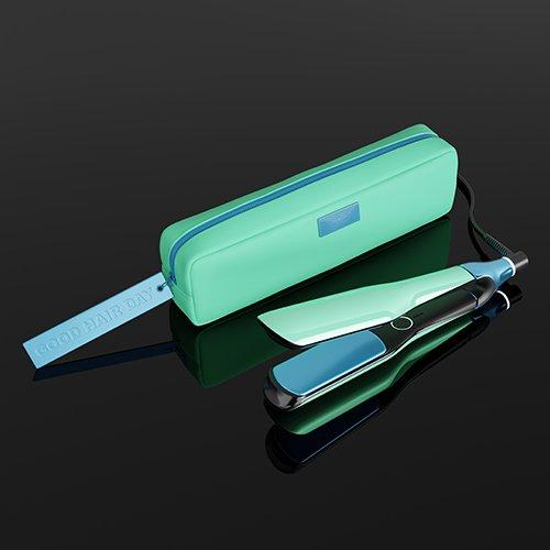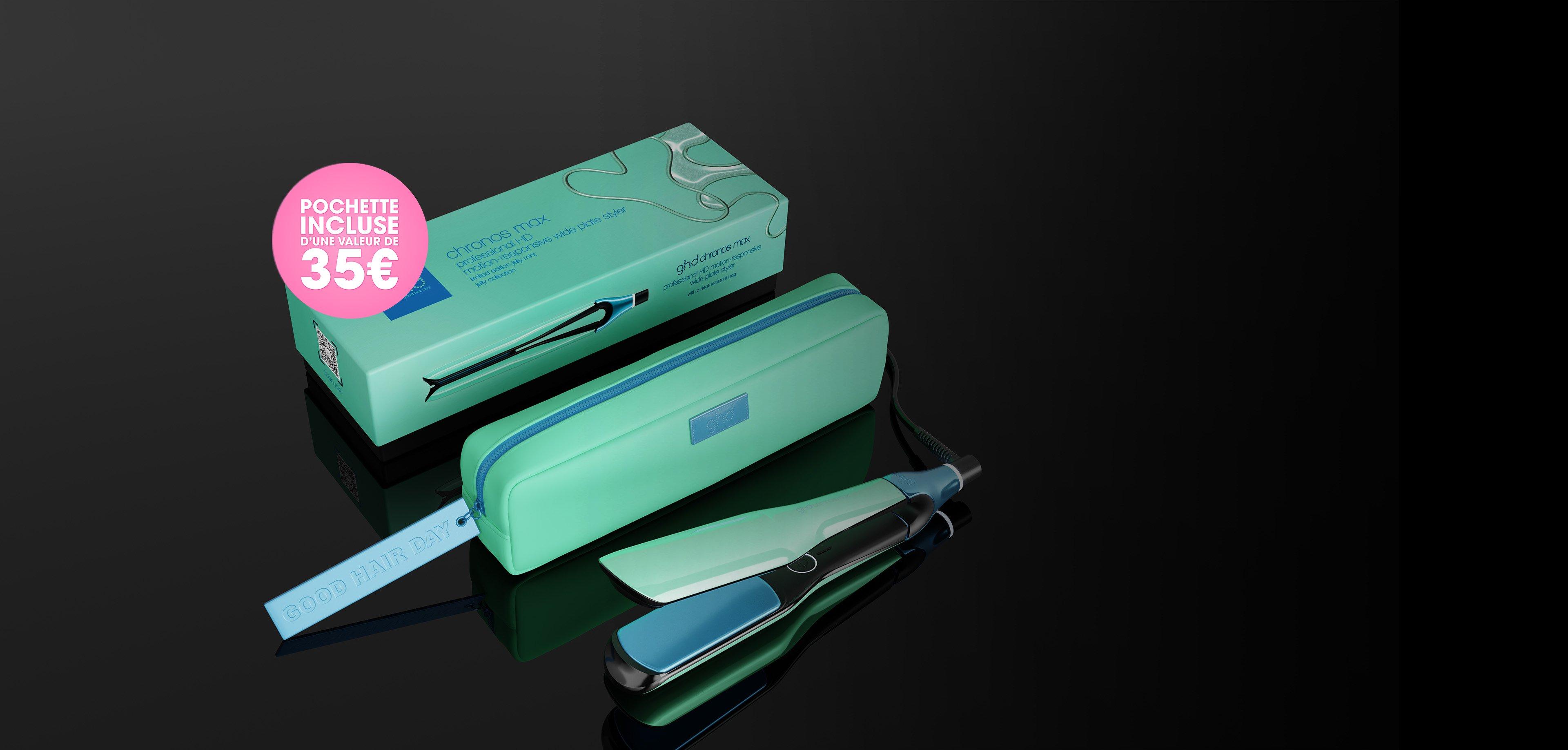 Le nouveau ghd Chronos Max se pare d'une teinte menthe gelée au glaçage bleu. Il est accompagné d'une luxueuse pochette thermorésistante assortie d'une valeur de 35€.