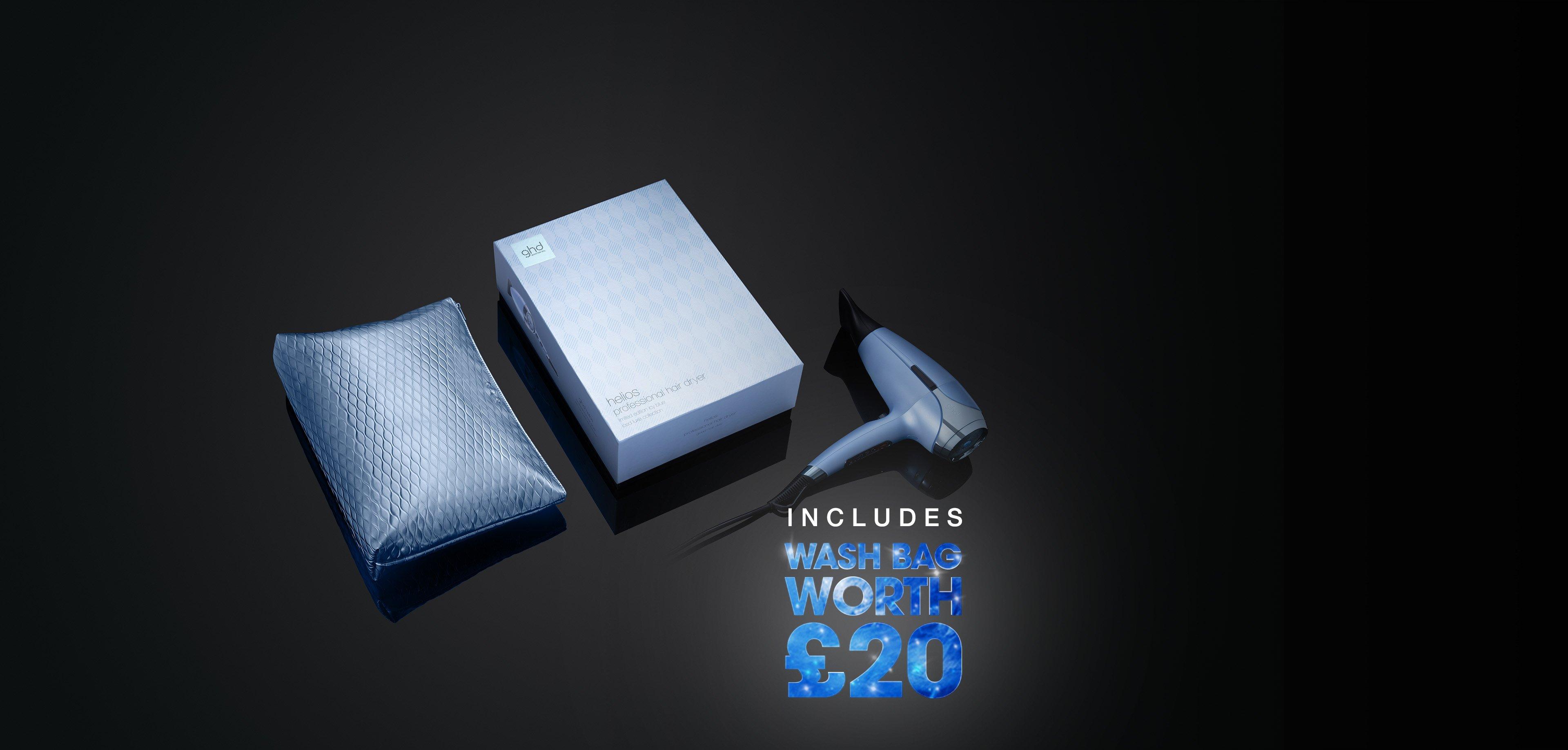 Create your ultimate look with the ghd helios™ professional hair dryer, beautifully presented in icy blue and nestled in a chic crystal blue wash bag.