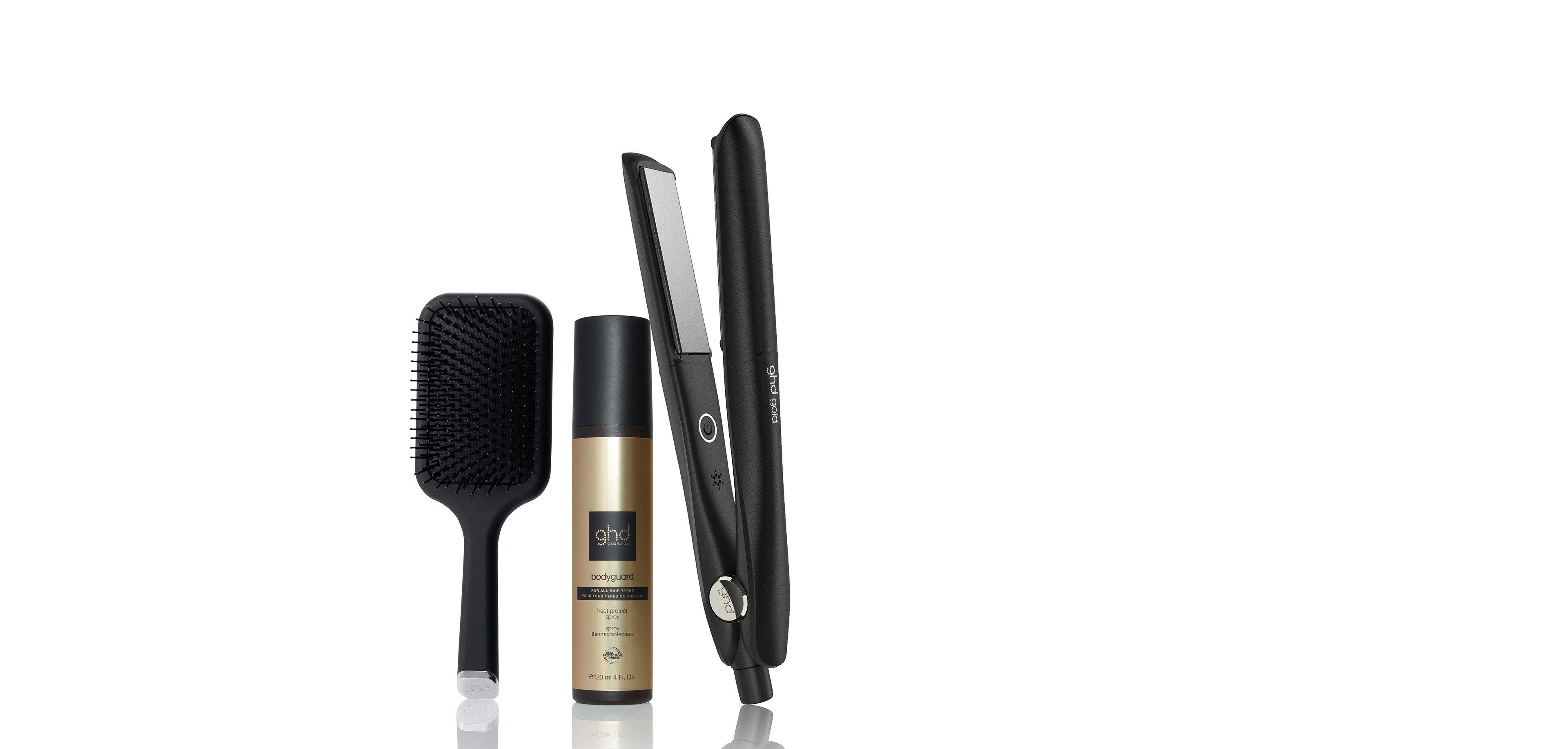 - ghd Gold Hair Straightener in Black, ghd Bodyguard for All Hair Types and ghd All Rounder Paddle Brush
