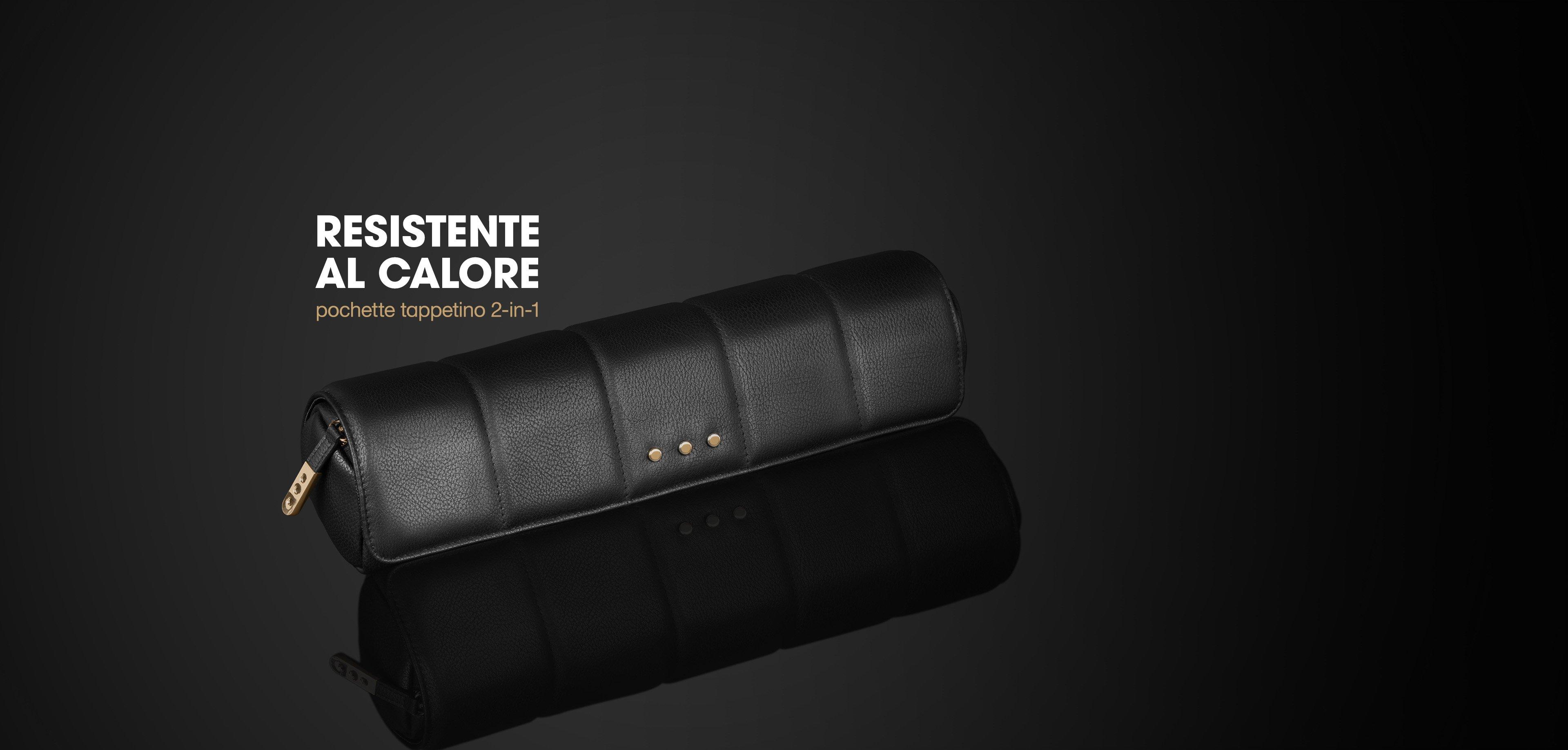 La borsa con zip si apre trasformandosi in un tappetino resistente al calore, per offrirti la massima tranquillità durante lo styling.