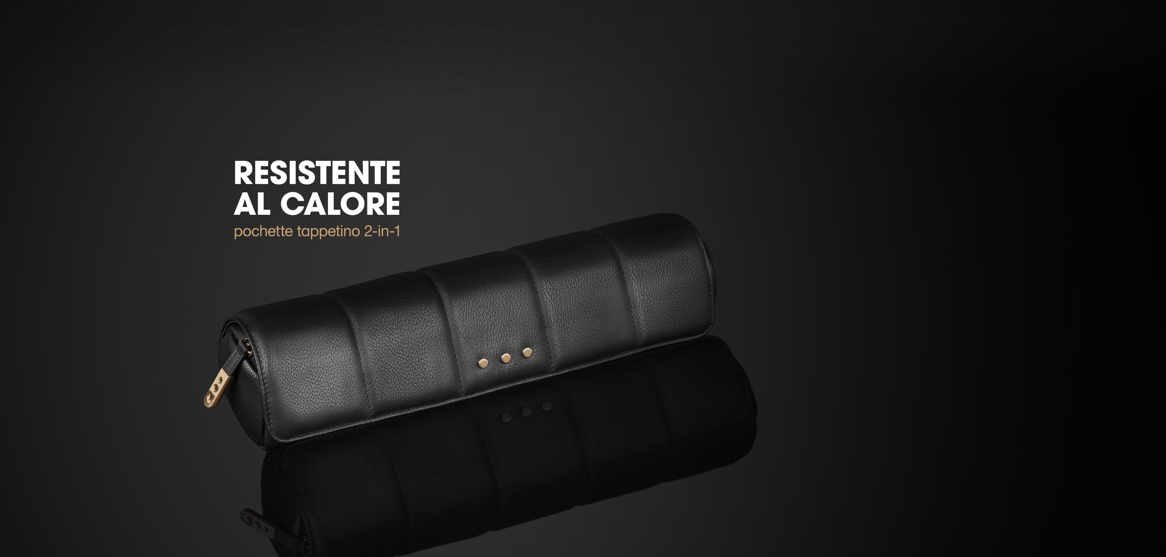 La borsa con zip si apre trasformandosi in un tappetino resistente al calore, per offrirti la massima tranquillità durante lo styling.