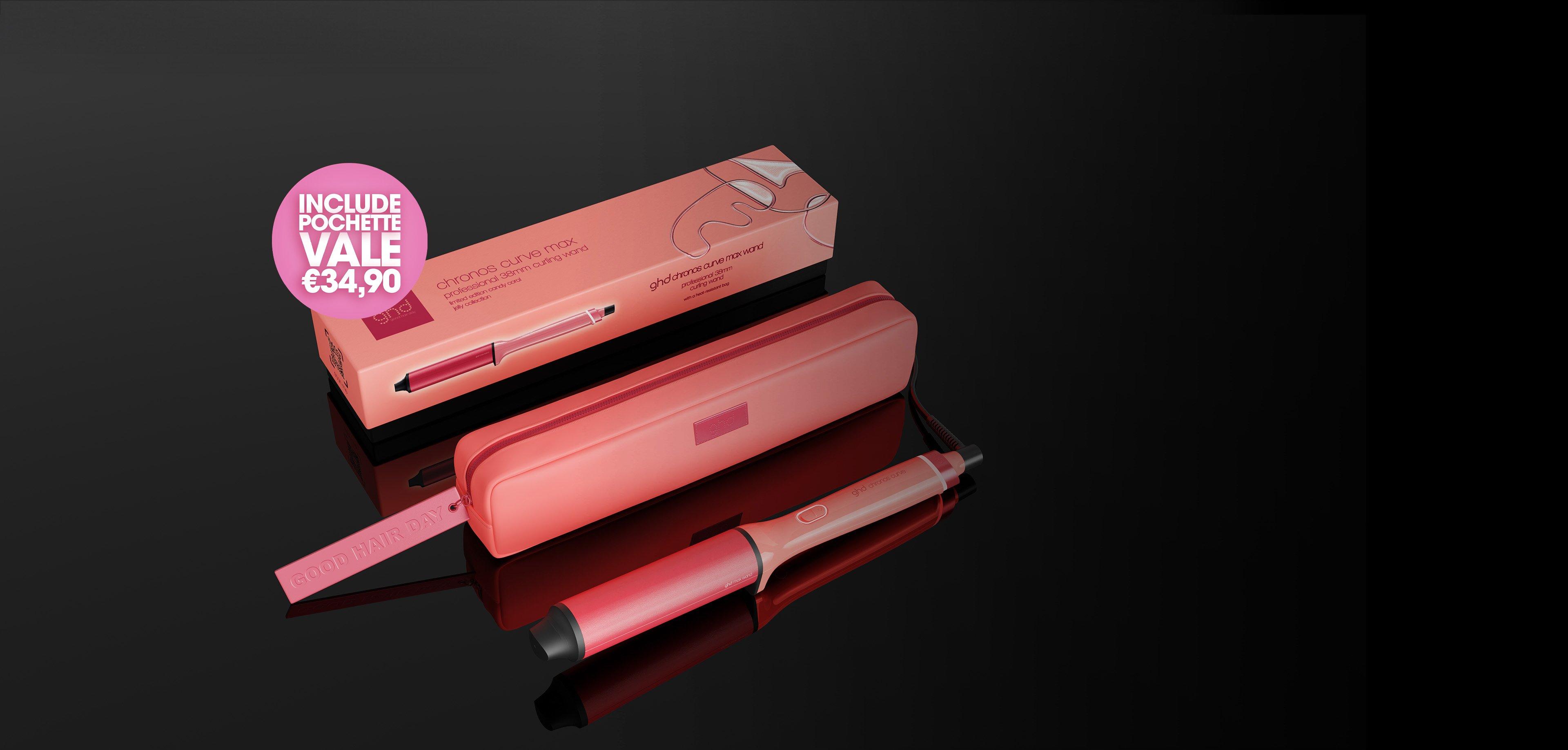 Il nuovo arricciacapelli ghd Chronos Curve Max Wand è rivestito dall'esclusiva colorazione candy coral con dettagli sugar pink ed è accompagnata da una pochette termoresistente (del valore di €34,90).