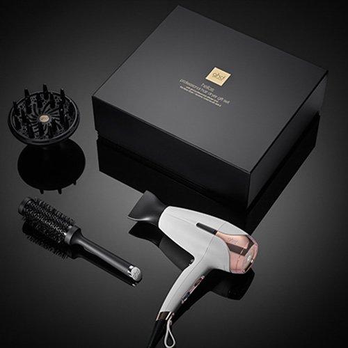 Il lussuoso gift set è composto dall'asciugacapelli professionale ghd helios™, dalla spazzola rotonda in ceramica - misura 2 ed il diffusore professionale ghd.