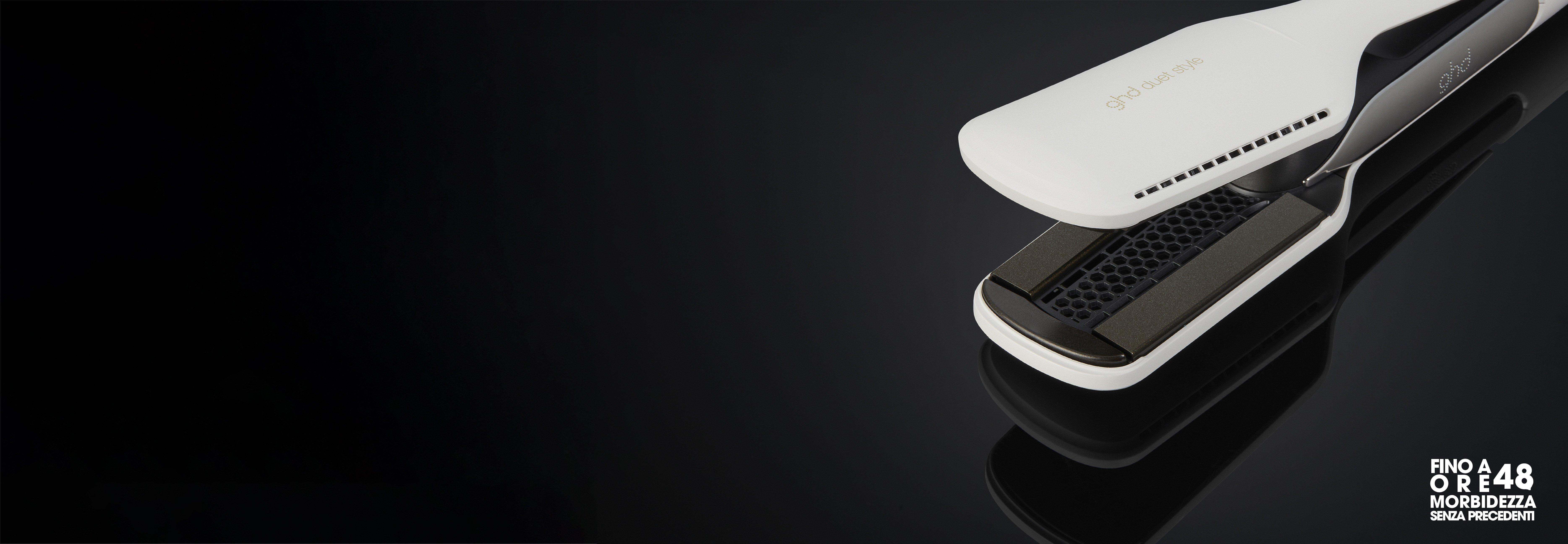 Realizzare il tuo look glossy non è mai stato così semplice. La nostra rivoluzionaria combinazione delle migliori tecnologie di asciugatura** e calore per semplificare la tua styling routine ottenendo un look splendido in poco tempo e con un solo tool. La ghd duet style è una piastra asciugacapelli progettata per offrire le migliori prestazioni con risultati WOW che rispettano l'umidità naturale dei capelli****, senza danneggiarli, evitando così di sentire l'indesiderato "odore di bruciato". Sperimenta la potenza della rivoluzionaria tecnologia Air-fusion™, un sistema aerodinamico unico che lavora in sinergia con 4 lamelle intelligenti a bassa temperatura all'interno di una camera di styling su misura. L'esclusivo sistema direzionale dell'aria concentra il flusso d'aria della styler per garantire un'asciugatura uniforme e uno styling dai risultati professionali. Realizza i tuoi look rapidamente e assicurati 48 ore di morbidezza**** senza precedenti con ghd duet style.