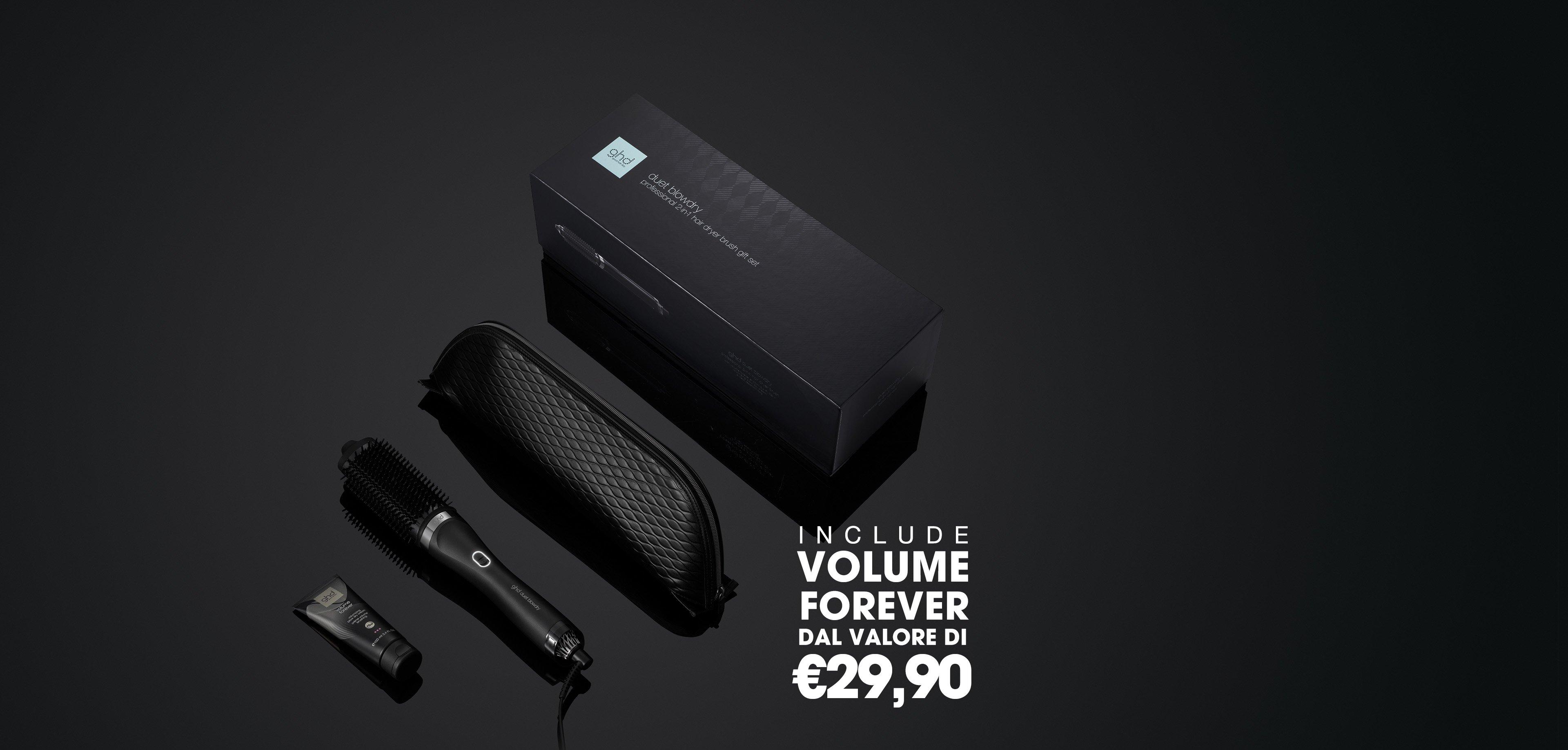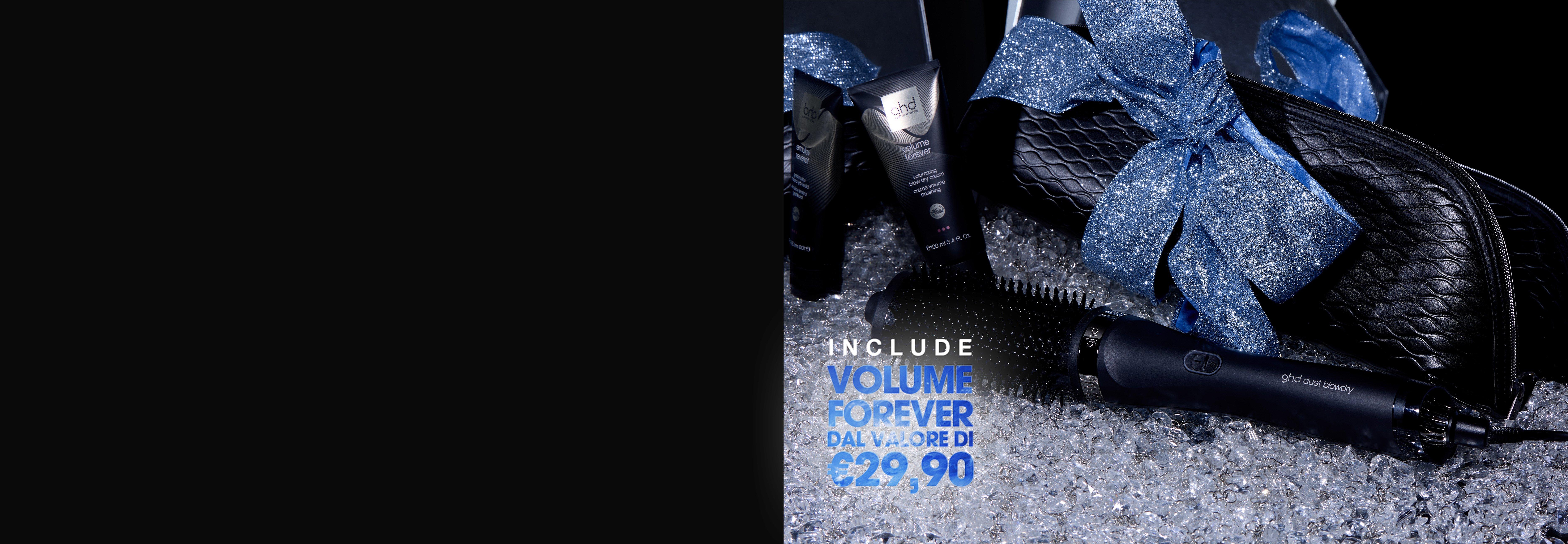 Ti presentiamo la nostra spazzola asciugacapelli 2-in-1, accompagnata da una lussuosa pochette resistente al calore e ghd volume forever - crema volumizzante per una piega impeccabile durante le feste (del valore di €29,90).