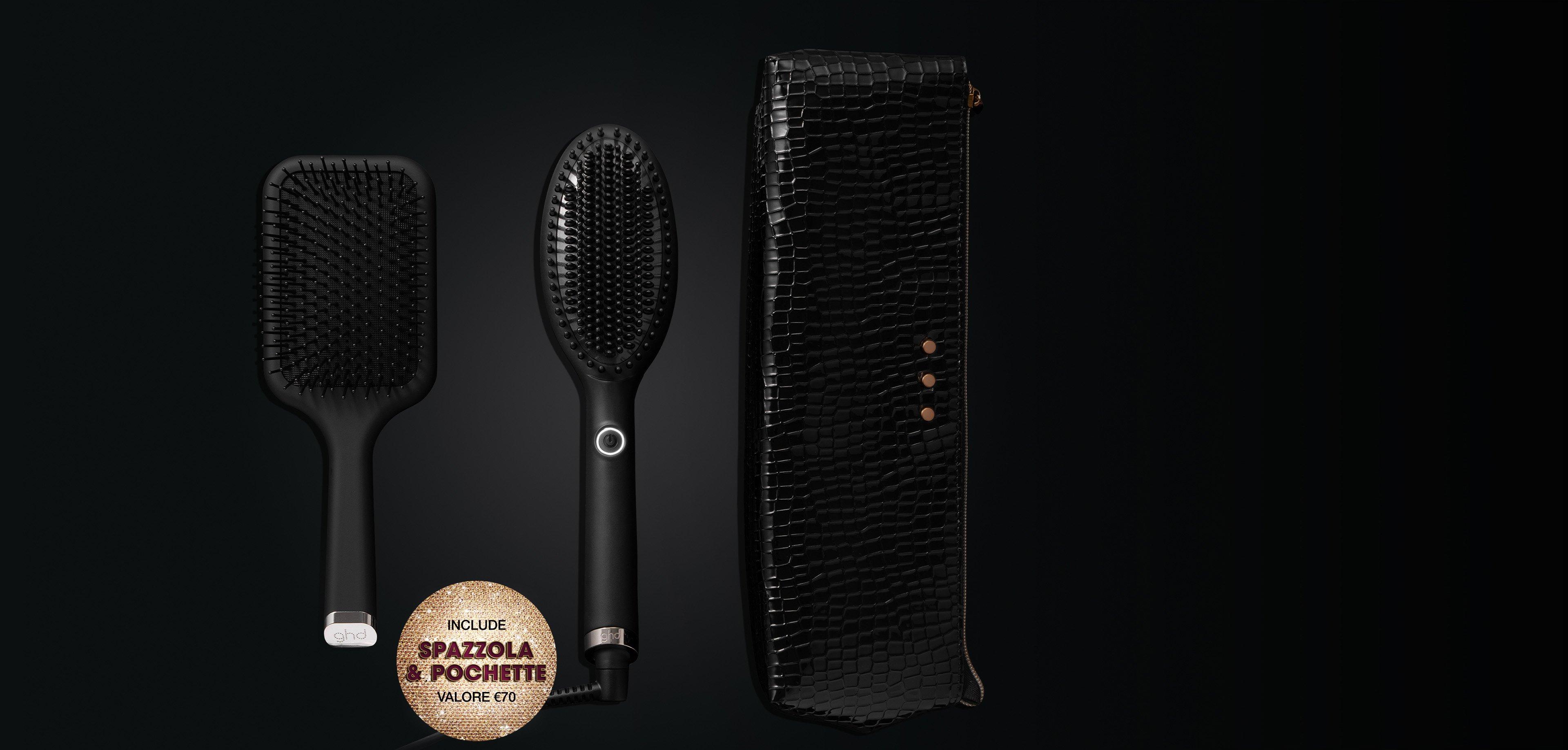 La nostra spazzola lisciante salva tempo ghd glide accompagnata dalla spazzola ghd paddle brush ed una pochette resistente¹ al calore.
