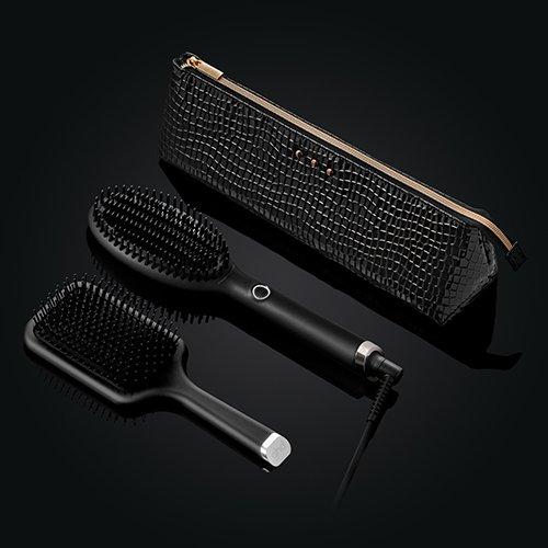 La nostra spazzola lisciante salva tempo ghd glide accompagnata dalla spazzola ghd paddle brush ed una pochette resistente¹ al calore.