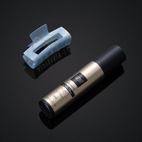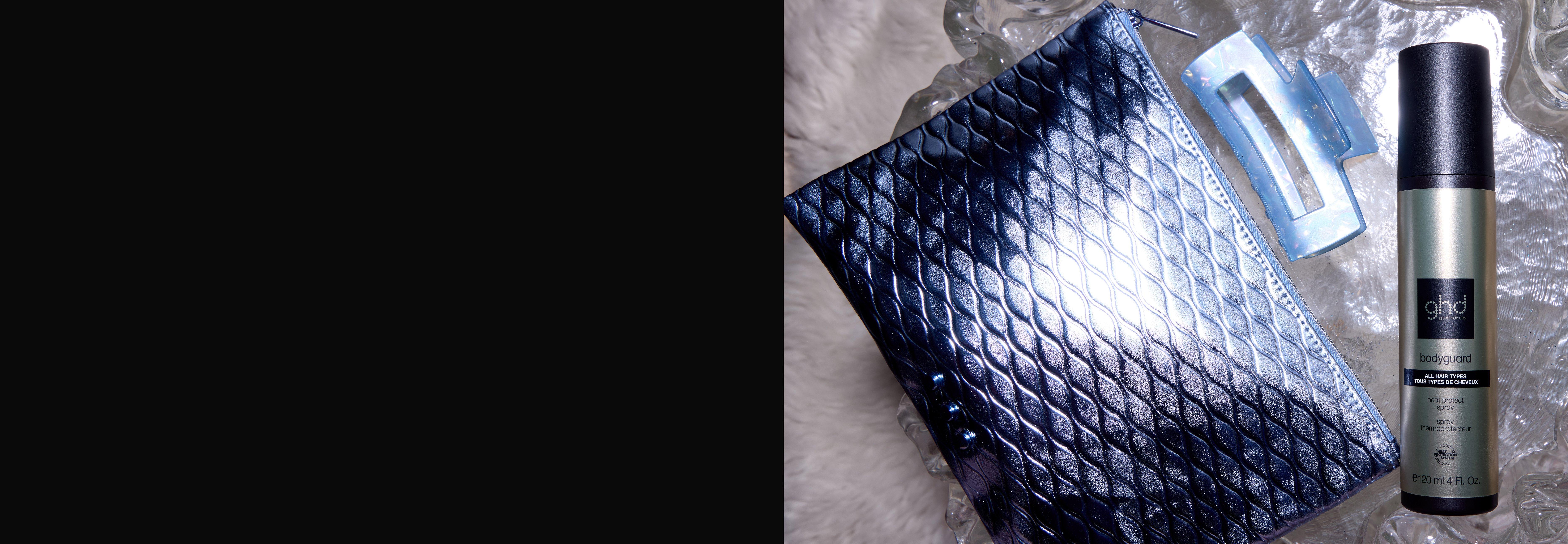 Una clip glam in tonalità blu ghiaccio e lo spray termoprotettore ghd bodyguard, all'interno di un'esclusiva pochette.