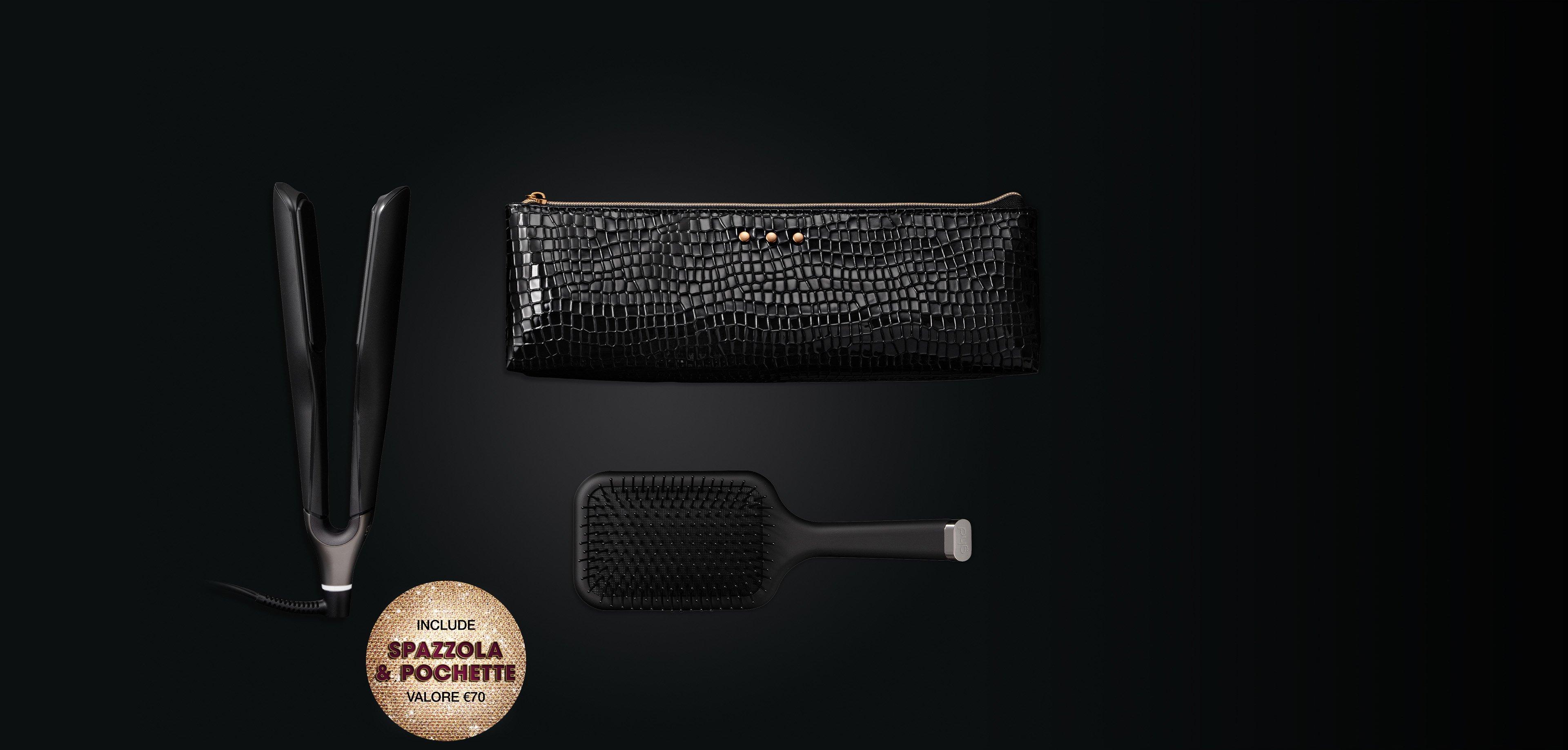La nostra styler professionale con con lamelle larghe ghd Chronos Max racchiusa in un'elegante pochette termoresistente, insieme alla spazzola per districare i capelli ghd Paddle Brush.