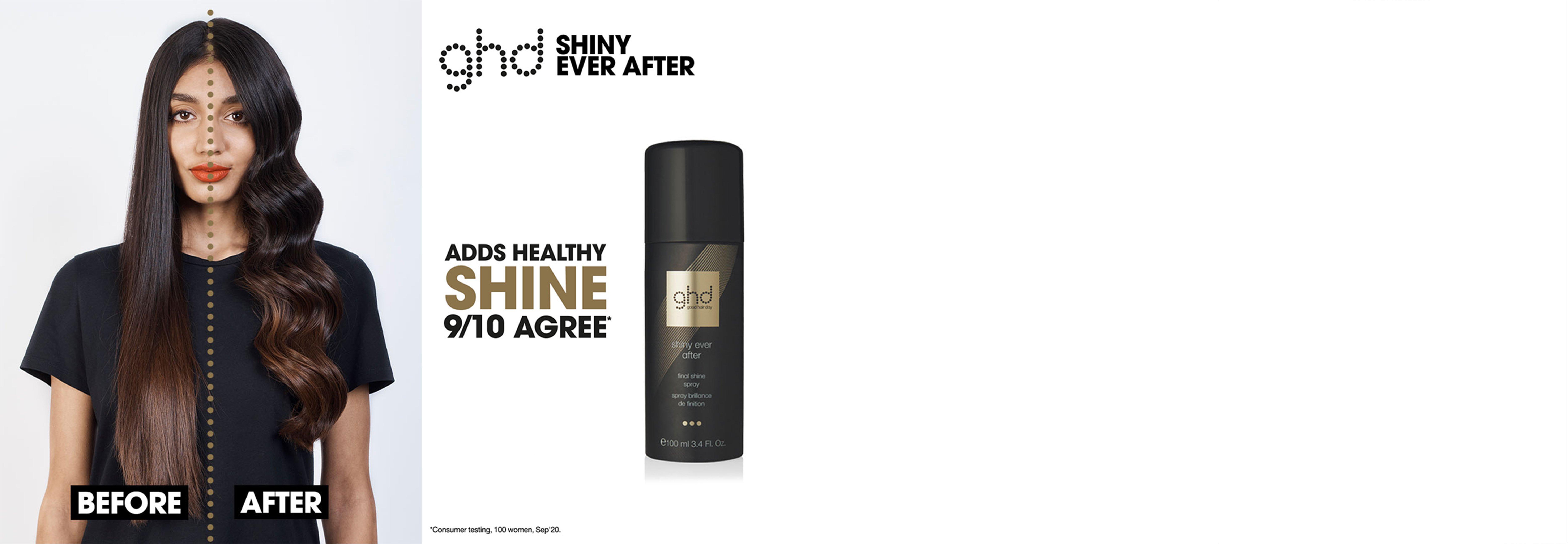 Ghd shiny ever after voegt direct glans toe aan je haar en werkt in perfect samen met je ghd styling tools om het maximale uit je looks te halen. ghd shiny ever after werkt als een fijne nevel, die je niet voelt zitten, 9/10 mee eens*, voor een natuurlijk effect en niet-vette resultaten.