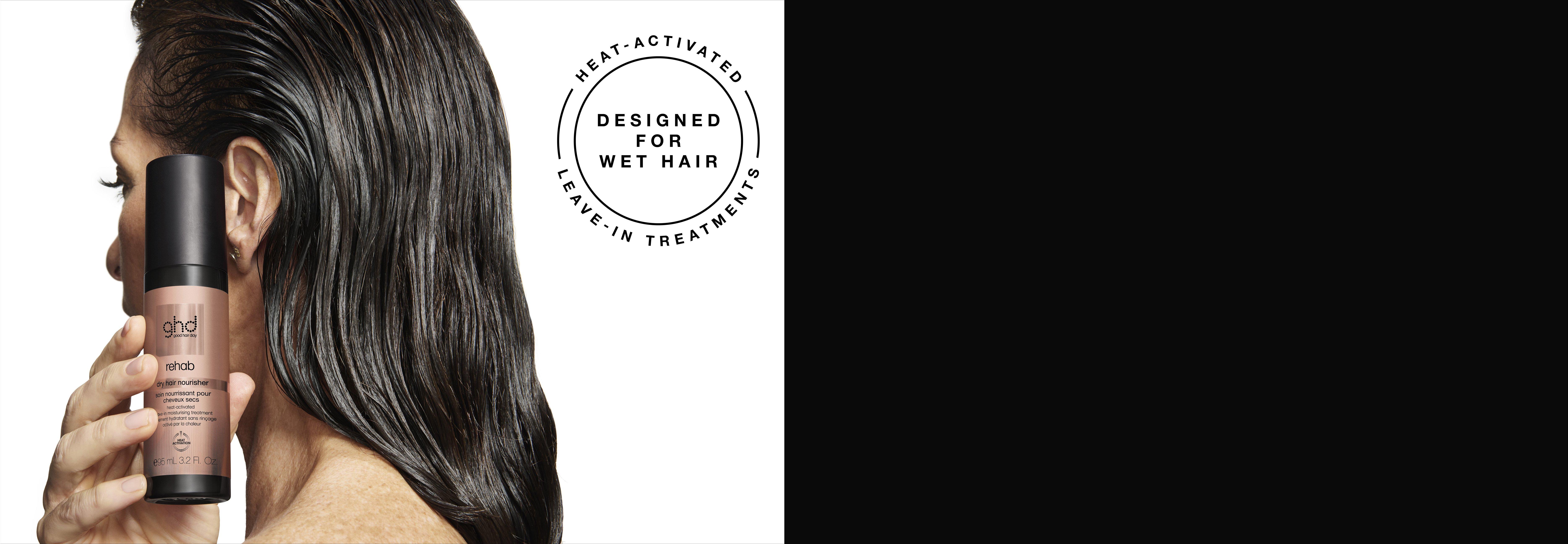 Behandel je haar met ghd Rehab en activeer het vervolgens met de hitte van je stijltang, föhn of wet-to-dry stylingtool.