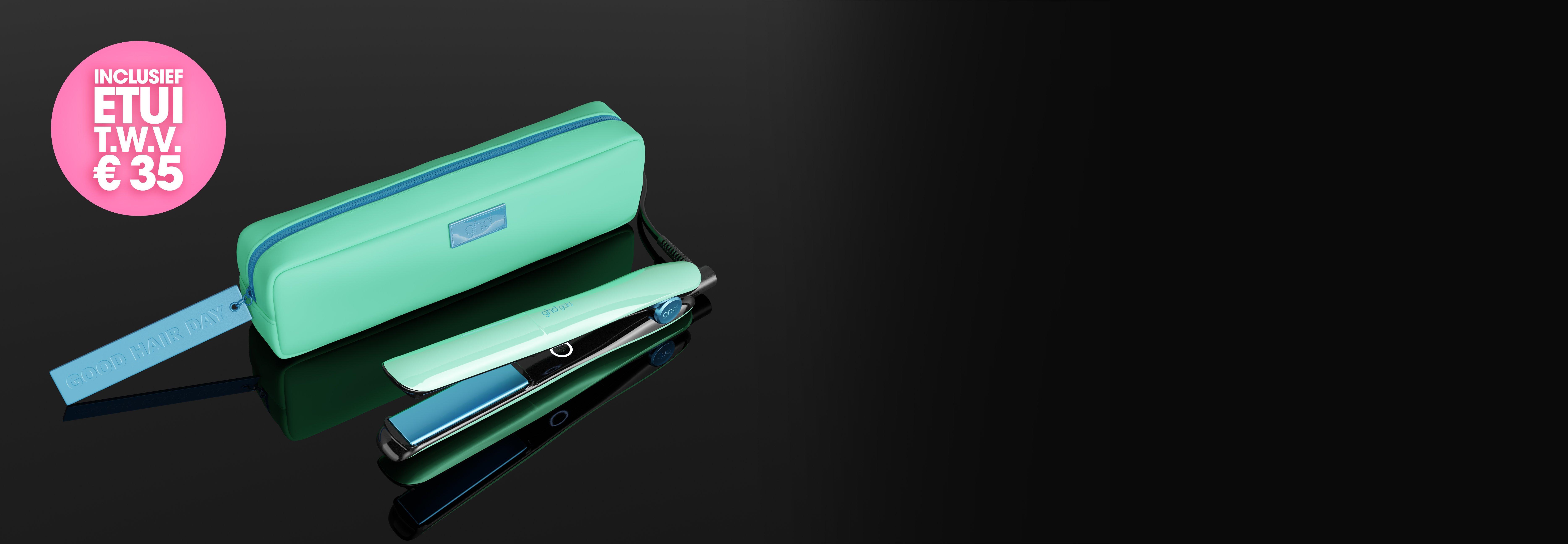 ghd Gold is uitgevoerd in jelly mint met glazed blue details en wordt geleverd met een luxe hittebestendige bijpassende etui t.w.v. € 35.
