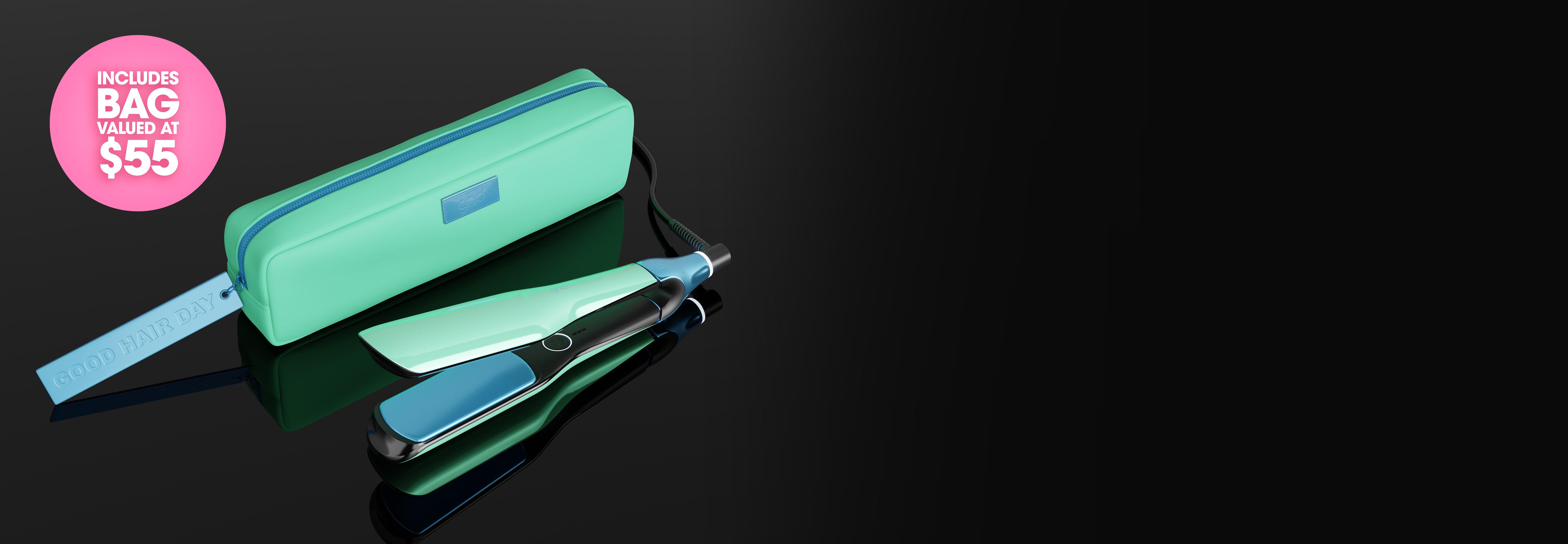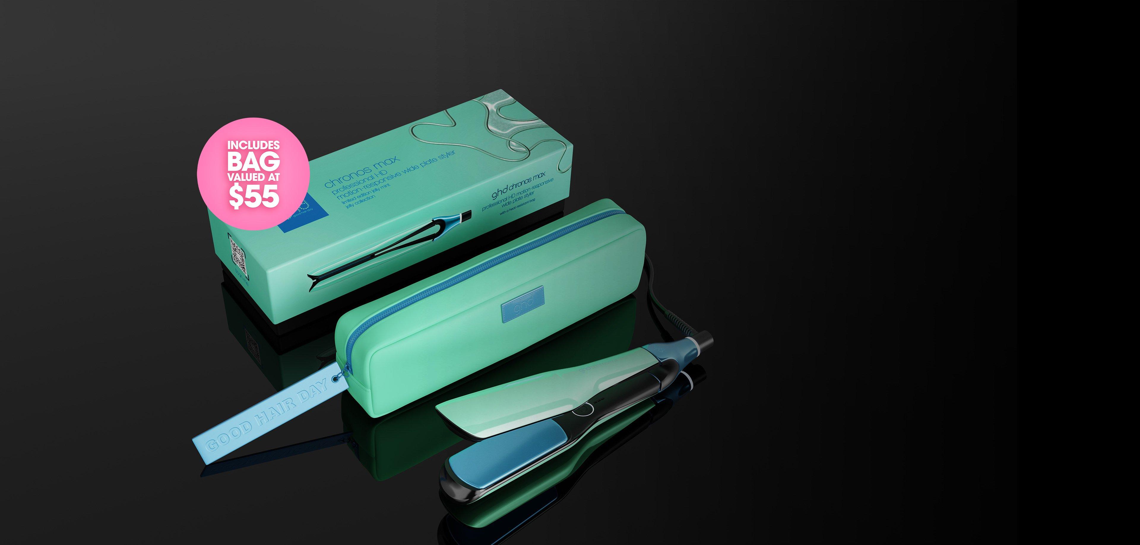 ghd chronos max has been dipped in jelly mint and glazed blue, accompanied by a luxury heat resistant matching bag valued at $55.