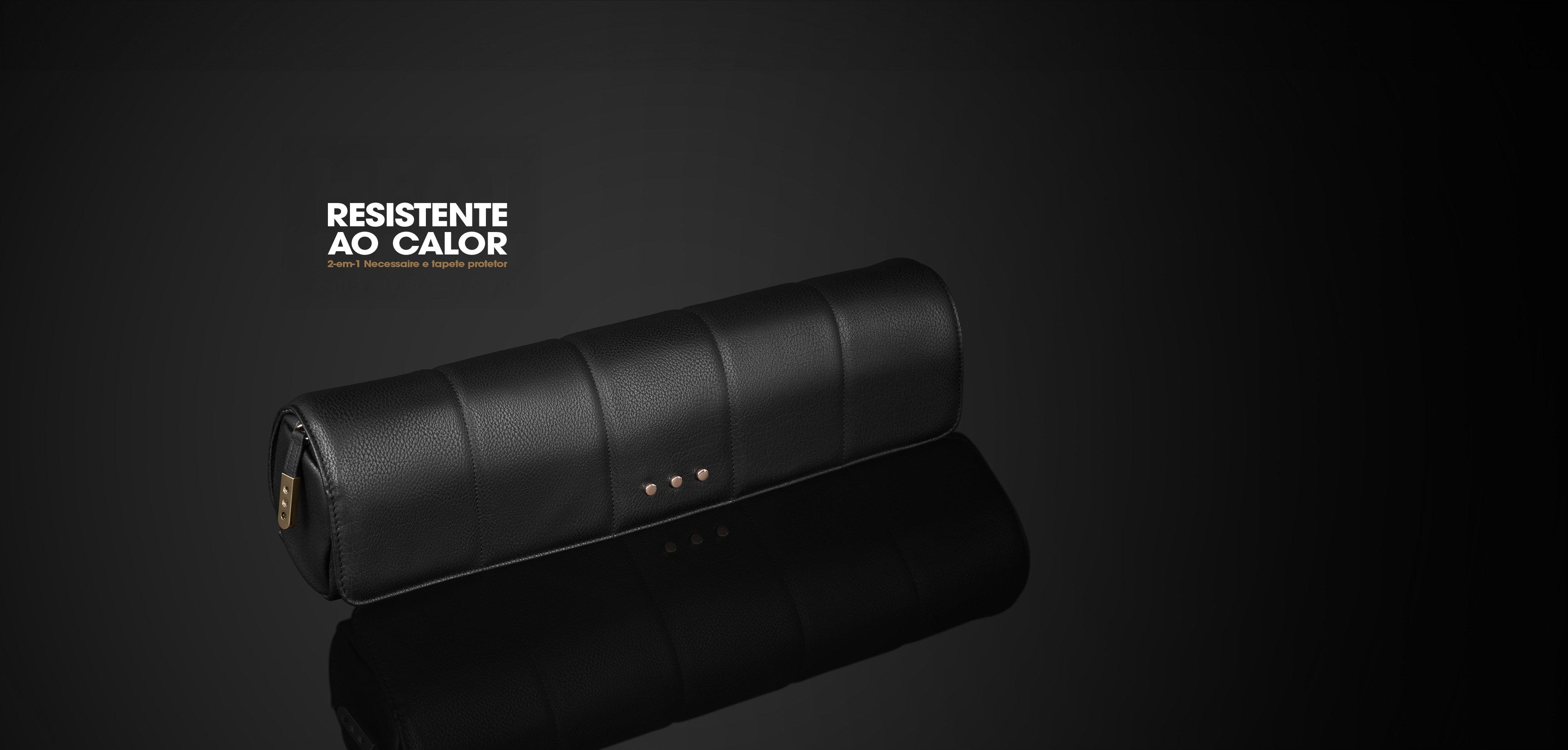 Necessaire com fecho que se desenrola num tapete resistente ao calor, para uma experiência de styling tranquila e segura.