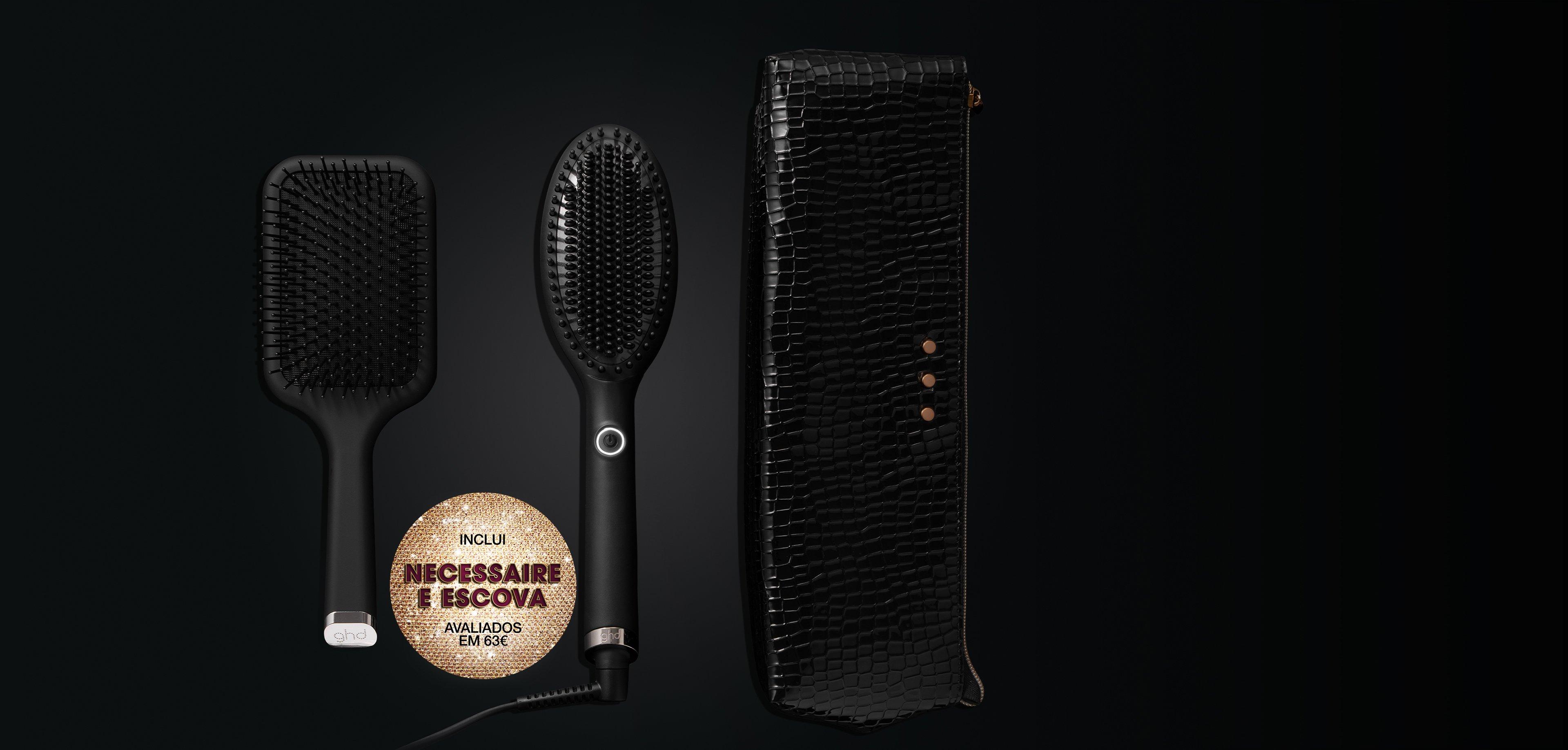 A nossa ghd Glide Hot Brush, que poupa tempo, vem acompanhada de um elegante necessaire resistente ao calor¹ e da escova ghd All-Rounder Paddle, para um styling festivo impecável.