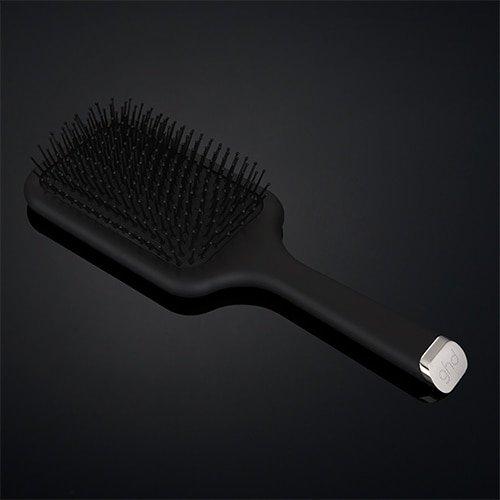 Acompanhar a prancha está a escova ghd All-Rounder Paddle — perfeita para desembaraçar, alisar e secar grandes mechas de cabelo com facilidade. A sua base larga e plana torna mais simples criar estilos lisos e polidos com acabamento profissional.