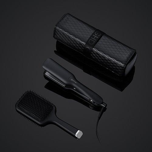 O nécessaire resistente ao calor da ghd⁵ proporciona armazenamento seguro e um local para descansar a tua prancha de cabelo em qualquer lugar, e a escova ghd all-rounder Paddle é perfeita para escovar, desembaraçar e estilizar cabelos de comprimento médio a longo, com uma base larga e plana que permite secar grandes seções de cabelo de forma lisa e reta.