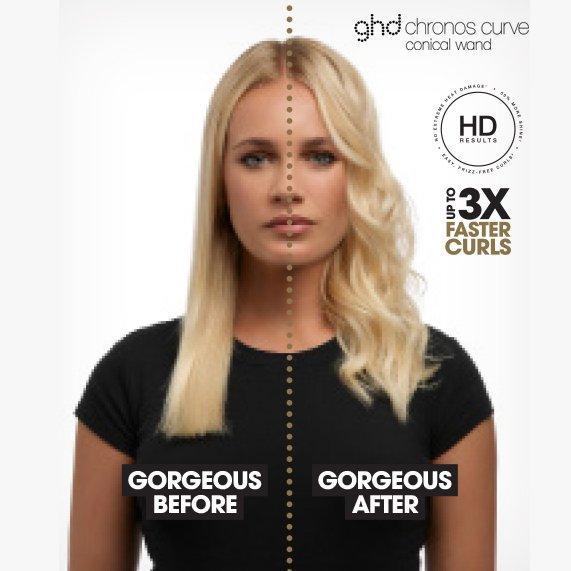 ¹ Extreme heat damage is defined as a fractional wet tensile strength reduction per cycle above 0.005, measured over at least 100 cycles on brown Caucasian hair (a “Strength Reduction”). *Compared to a competitor curling wand set between 356°F and 374°F. Lab test measuring the time required to form curls of the same length. **When used with a curl hold spray. Technical test measuring curl retention in a humidity chamber at 50% relative humidity.