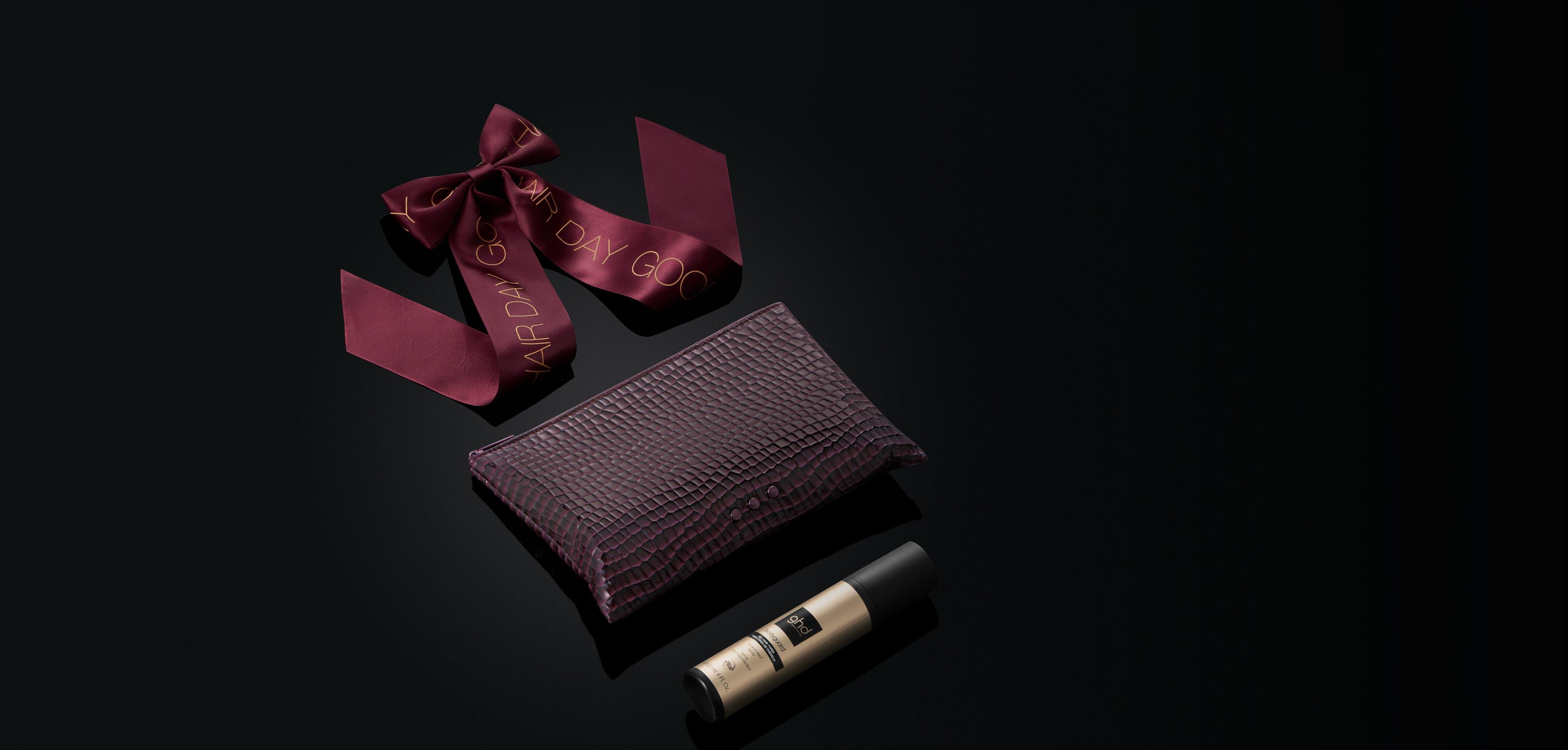 A limited edition hair clip with bow, our ghd bodyguard heat protect spray and an exclusive wash bag.