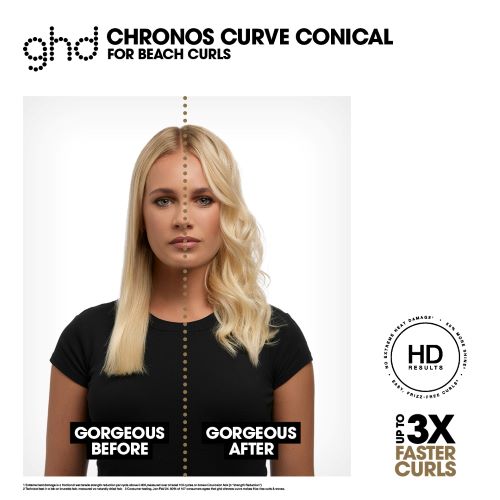 ¹Extreme heat damage is a fractional wet tensile strength reduction per cycle above 0.005, measured over at least 100 cycles on brown Caucasian hair (a “Strength Reduction”) *Vs. competitor curler set between 180-190°C. Lab test measuring time taken to form the same curl length **When used with curl hold spray. Technical test measuring curl retention in a humidity chamber at 50% relative humidity