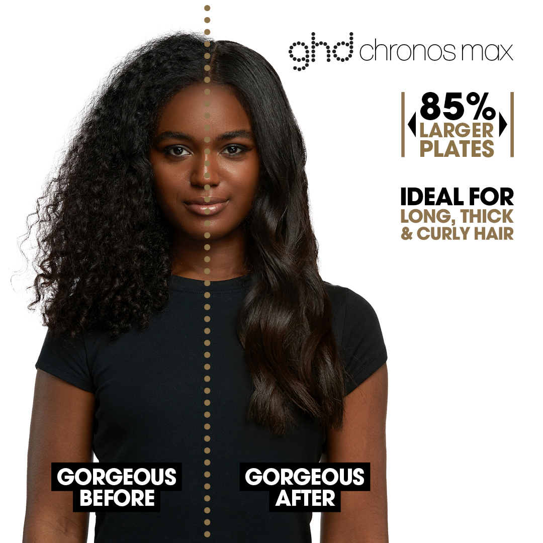 *vs. ghd Gold **vs. ghd Max. Technical test in lab show ghd Chronos Max is 3x faster to achieve same high level of frizz reduction on frizzy tresses. ***Consumer testing, Nov'23. 82% of 112 consumers agreed ghd Chronos Max gave 24-hour lasting style † Technical test in a lab on frizzy hair, vs naturally dried hair. †† Technical test in a lab on wavy hair, vs. naturally dried hair.