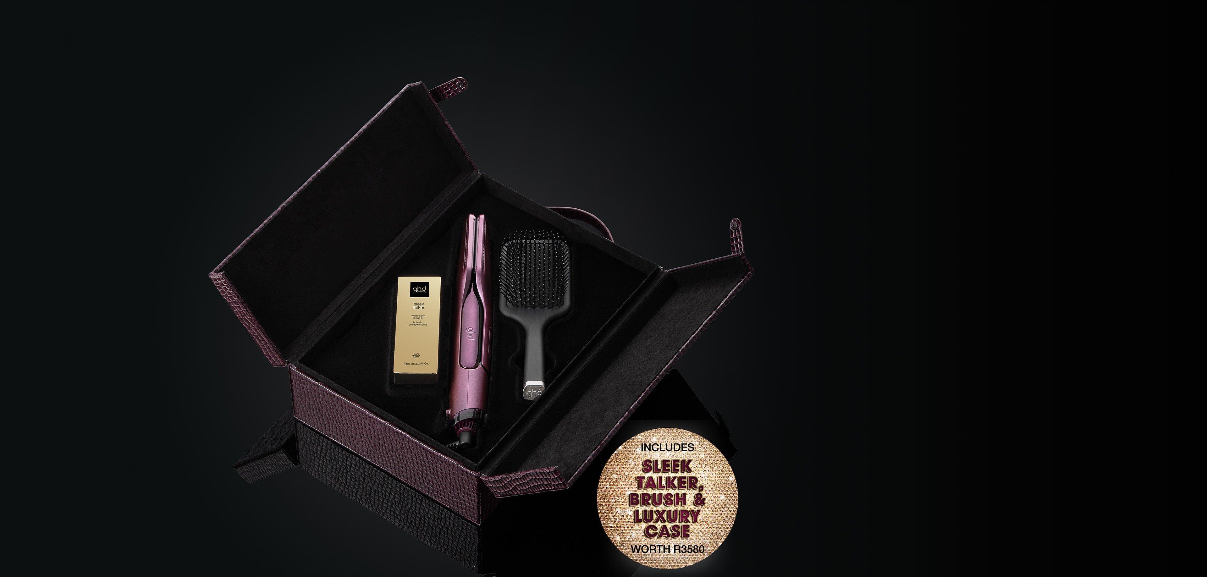 Enclosed in an exclusive deep red vanity case with a luxurious finish to store your limited edition hot air styler in style, including complimentary accessories: ghd Sleek Talker and ghd paddle brush worth R3580.