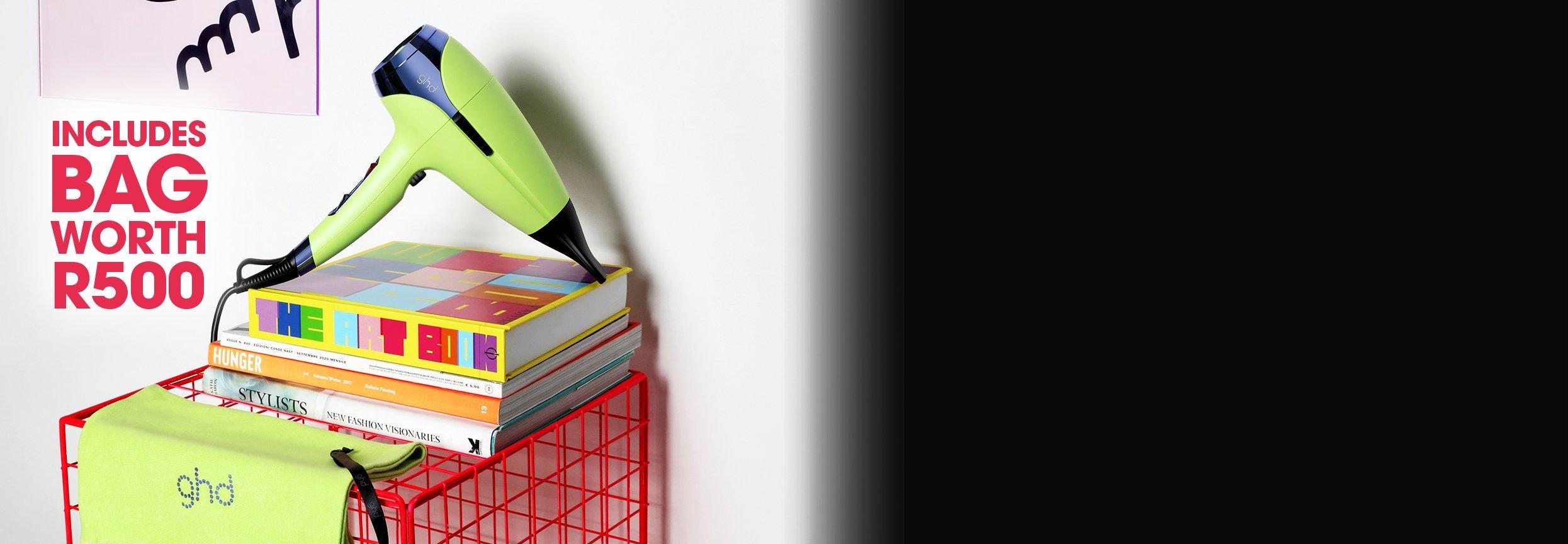 ghd helios™ has been wrapped in an energised neon green hue with contrasting metallic accents and is accompanied by a matching dustbag (worth R500).